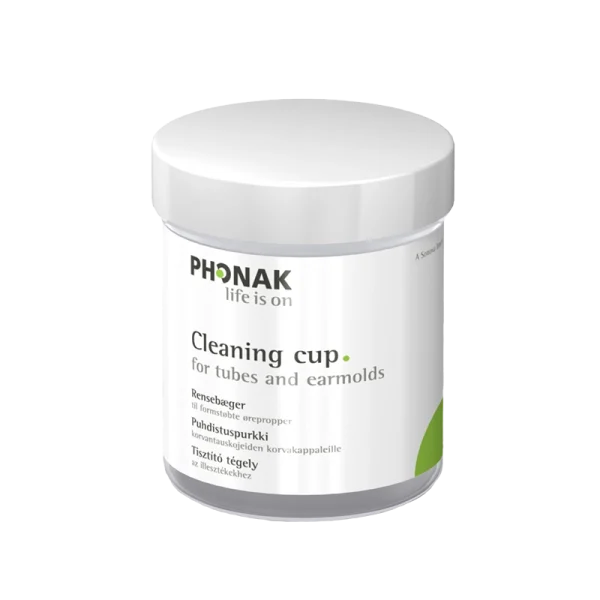 Mit dem Phonak Reinigungskup können Sie einfach und schnell sicherstellen, dass Sie immer ein sauberes Hörgerät haben, da Sie nur warmes Wasser und eine Reinigungstablette in den Reinigungskup geben müssen.