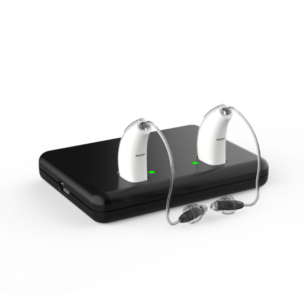 Die Verwendung des Ladegeräts ist einfach, da Sie Ihre Hörgeräte einfach in die beiden passenden Löcher im Ladegerät einsetzen. Die LED-Leuchten des Ladegeräts zeigen an, ob die Hörgeräte richtig in das Ladegerät eingesetzt sind, sodass Sie immer sicher sein können, dass sie richtig geladen werden.